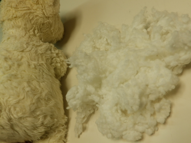 それで、今回はこれまでと中綿の様子がちがうようで、かなりべったりしたおはぎ状になっています。再利用はできなくもないですが、どういうわけかツルツルした感じがなくなっていました。今回は中綿を交換させてくださり〜