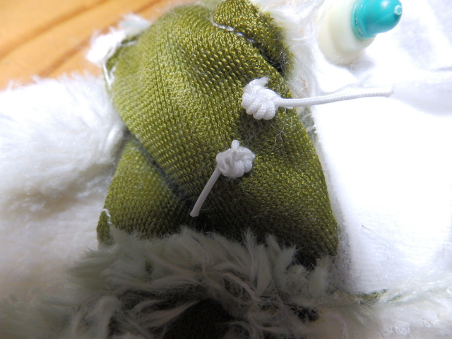 おヒゲはこんなふうになっていて、裏からひっぱるとすぐに抜けてしまう仕様になっていました。おヒゲの結び目みたいに見えるところを生地に縫い付けますね。