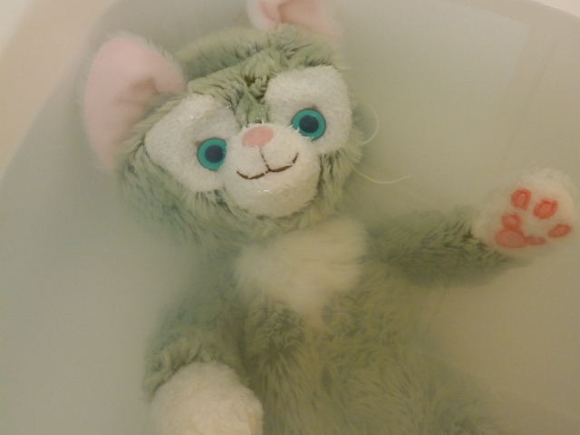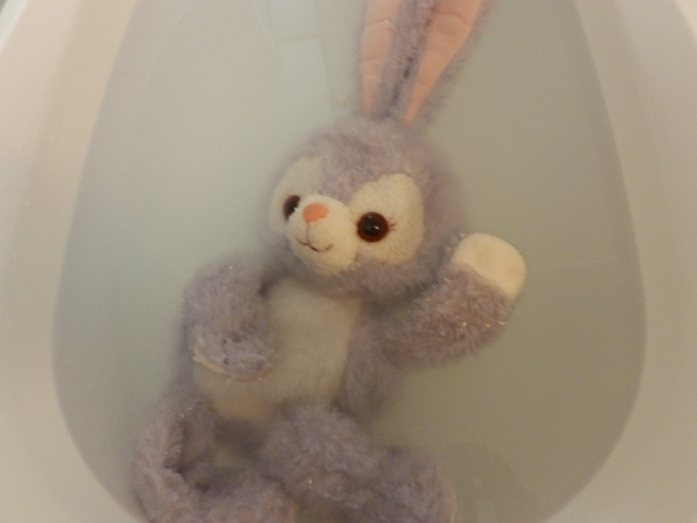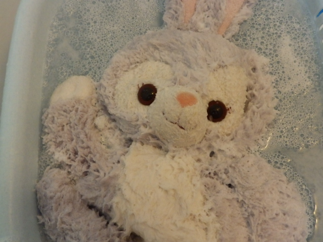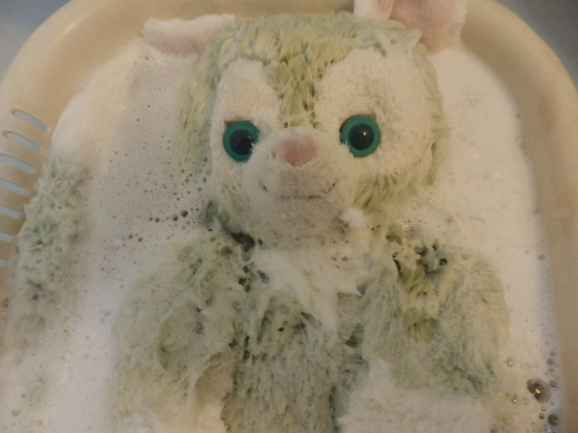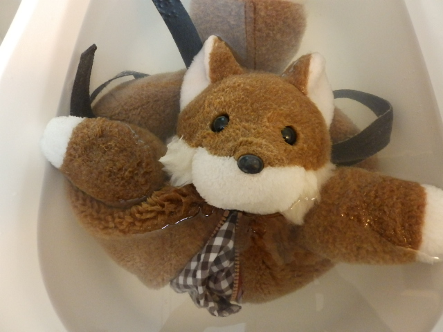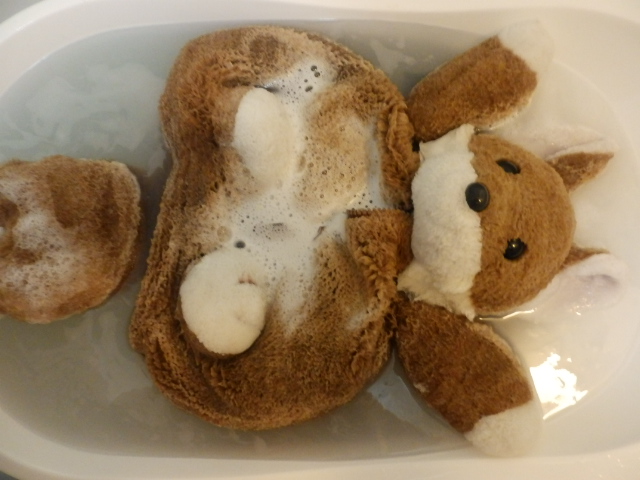 こんこんさん、それほど汚れは多くありませんでしたが、オフロに入ってみたら、ゴワゴワに見えた生地がだいぶキレイな毛並みになりました。