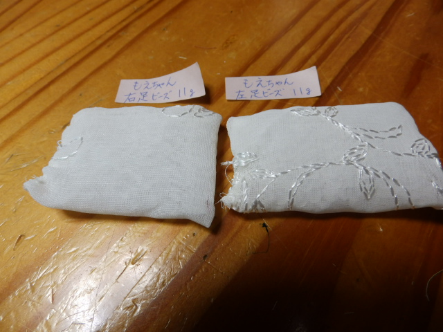 次にもえちゃん、55cm/315gで計算しまして、オフロ3700円、ビ白スカ湯1800円、なめらか温泉湯治*3700円、ビーズ袋・左右(11gずつ)1000円、綿交換6000円(ジェラちゃんと同じ)