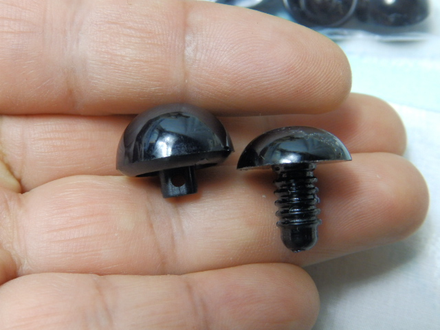 他方、左側はビビビ材団に在庫がある18ミリのオメメです。軸がないので、糸で引っ張る感じになります〜