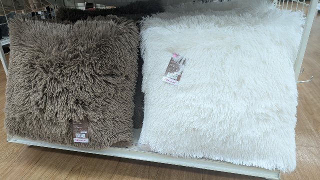 つい先日、ダイソーで発見した500円クッションがチョコミちゃんの毛毛に似ていました。色合いは微妙に異なるのですが、記事やさんに探しに行く他に、このようにシャギーっぽい生地を見つけることができます。