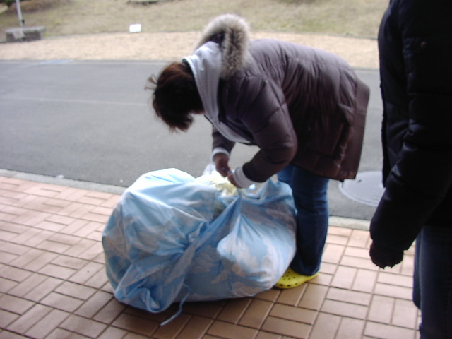 オフロから上がってきたぬいぐるみがゴロンしておやすみになる「青空」が、まさにその風呂敷になっていて、実際に東日本大震災の時に、ぬいぐるみを役つつんで一斉に避難することに立ちました。(写真)