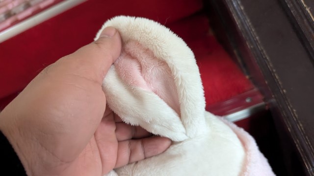さて、実際には、オミミのボーンがどうなっていたか紐解いてみました。おそらくは、手触りと壊れの具合からこのようにボーンがついていたのだと思いまするボーンの形状は2本の針金が並行していて白いビニールの被覆があります。テレビのアンテナの300Ωの並行ケーブルみたいなものです。右側は並行していた2本の針金が1本ずつに分離していました。かなりの回数、オミミをぐにぐにと動かされた過去があるのかも知れません。というのは、反対側の左耳は被覆が破れてはいないものの、多数のひび割れがありました。それで、この針金をほうっておくと、針金の先端が凶器となって生地を破って突き出てきたり、人が怪我をしてしまうこともあります。 ◆掲示板に画像を投稿したい・投稿できない・リサイズってなーに?