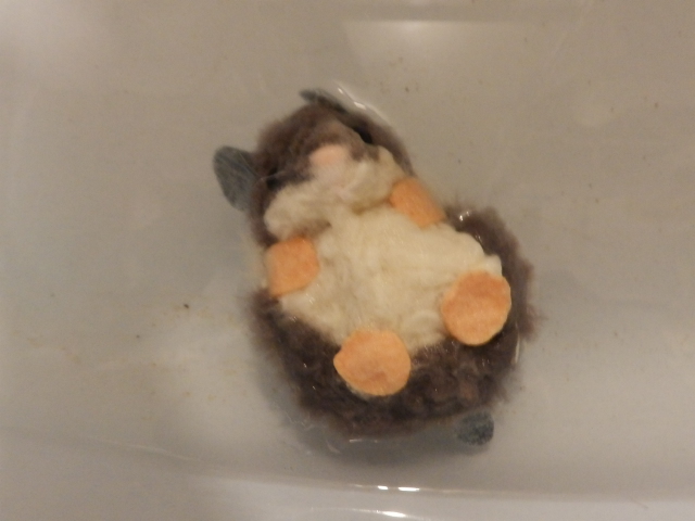 わぁ、そうなんですね。南三陸のおみやげでしたか〜 三陸はどこへ行っても美しい風景ですよね。タマンはコロナ禍の時に、青森から仙台まで10日以上掛けて旅行して、三陸の旅を満喫したことがありました。さて、こはむちゃんは素材がレーヨンというもので、セルロース、いわゆる木材が原料の不思議な生地です。人工の絹糸でキラキラしてます。これ、ビーちゃんと同じで、ちょっと扱いに気をつけないとイケマセン(いろんな意味でw)それと、茶色い汚れの正体は、ハムちゃん同様、ちょっとわからないことが多くて、工夫が必要です。でも、レーヨンはなめらか温泉湯治にめっちゃ向いている素材なので、いかがでしょう〜 それと、おしりには着座用のオモリとなりビーズが入っていますね ◆掲示板に画像を投稿したい・投稿できない・リサイズってなーに?