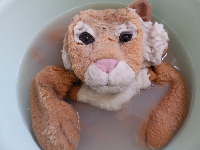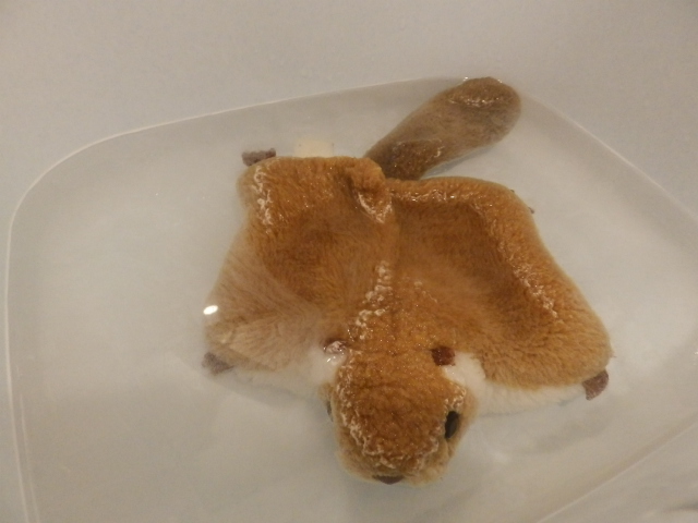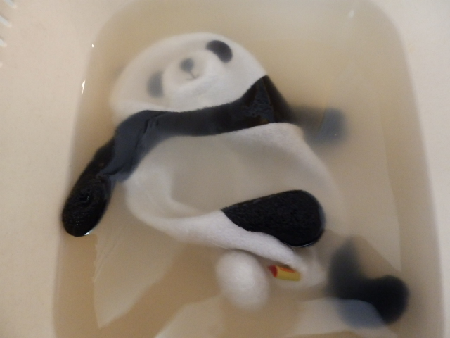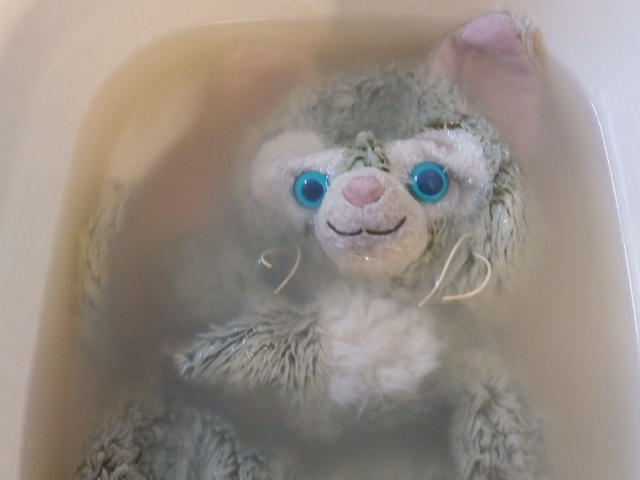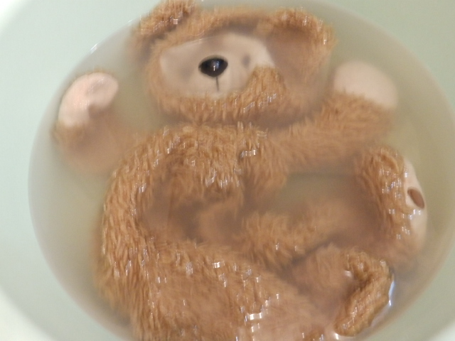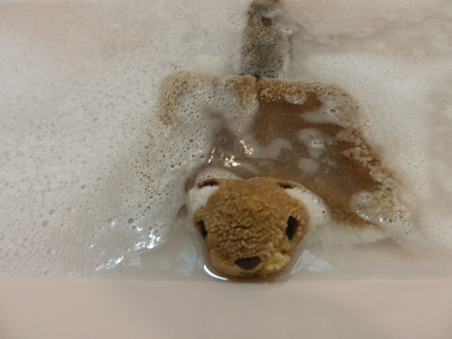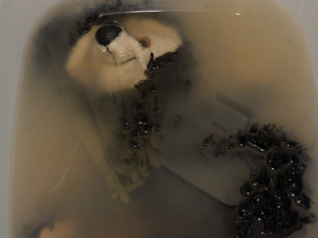 はい、それではまずはオフロへどうぞ〜だっふぃー君は、48cm/271gで計算しまして、オフロ3400円、ビ白スカ湯1700円です。ところどころシミはあるものの、全体的な汚れがけっこう多くて、ビ白スカ湯でなんとかなるでしょう〜 綿交換4000円で、小計9100円です〜写真がボヤけてスミマセン。おぼれたり、あばれたりしてるわけではないですー ◆掲示板に画像を投稿したい・投稿できない・リサイズってなーに?