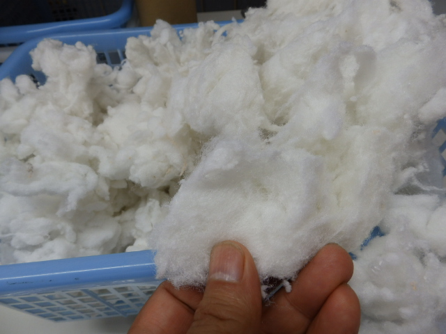 綿の交換をなさったことがあるとのことで、すでにご存知かとは思いますが、中綿はこんな感じでして・・・ 胴体部分はポロンポロンと崩れてしまって小麦粉すいとんのヒラヒラした感じに似ています。頭部の綿はベッタリとくっついていて、取り出しが難しかったです。原理としては、繊維の集合体が洗剤に触れて摩擦がかかると、フェルトみたいに繊維同士が絡まってしまいます。これはどうやら天然の獣毛でも、化学繊維でも、事情は同じようです ◆掲示板に画像を投稿したい・投稿できない・リサイズってなーに?