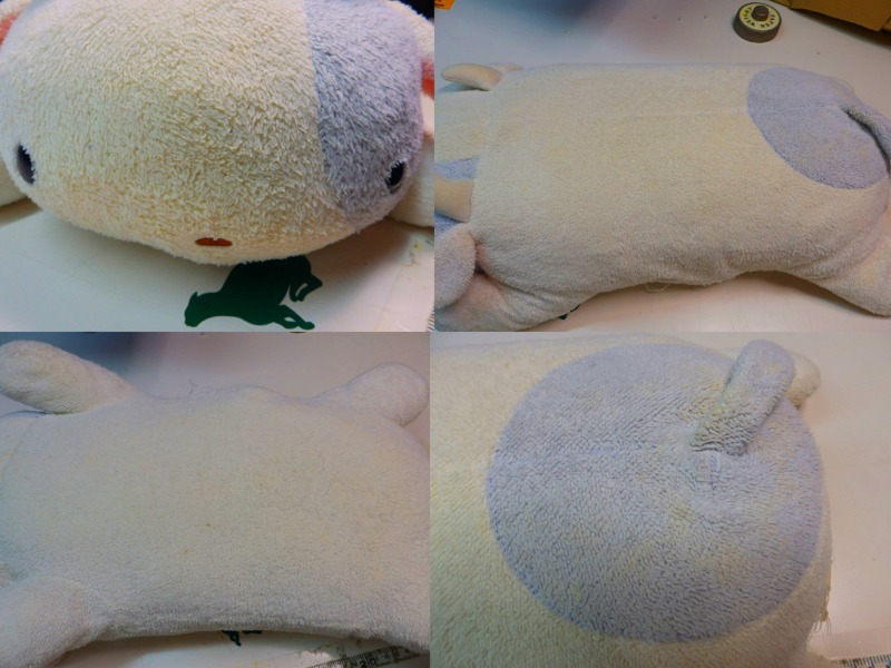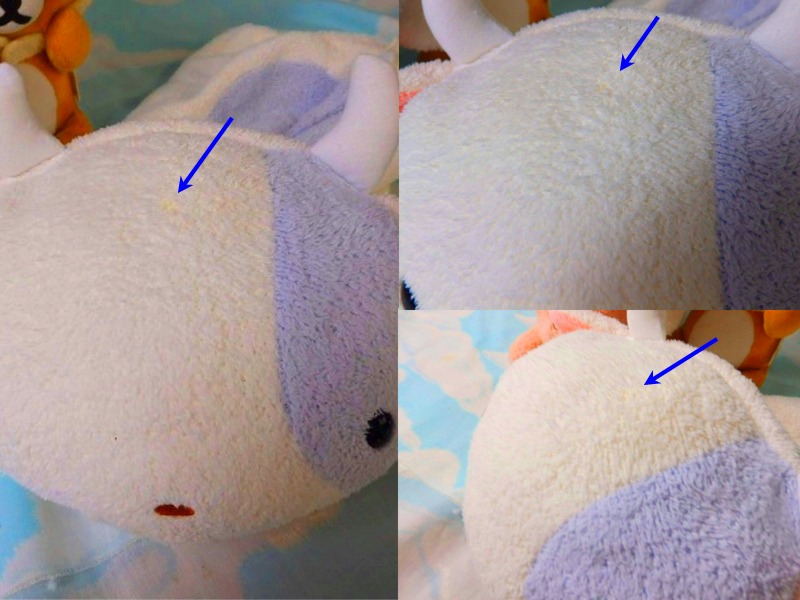 ちょいとレタッチソフトで現在の色味を強調してみました。すると、このように黄色い部分が目立ちます。これは、油分・タンパク質が酸化してこうなってると思われまする。時間がかかりますが、キレイになります〜その他、いろんなものが黄色くなる理由汗や皮脂汚れ:衣類に付着した汗や皮脂(タンパク質や脂肪)が、時間の経過とともに酸化することで黄色く変色します。特に襟や袖口は汚れが蓄積しやすく、黄ばみやすい箇所です。ワイシャツの襟が黄色くなったり、キレイに洗ったのに、時間がたつと黄変してくることもあります。この場合は、時間をかけて黃変を改善することが出来ますが、次のような場合はヤッヴァーイかもしれませぬぬいぐるみのみんな様は、主に化学繊維で出来ていますが、羊毛(ウール)や絹(シルク)、化学繊維でもナイロンは黃変しやすく、その原因は日光の中の紫外線です。うしさんは、全身がほぼポリエステルでナイロンは含まれていないようです〜プラスチックやビニールが黃変することもありますよね。主に空気中の窒素酸化物と反応したり、熱や紫外線でも黄変することがあり・・・たまーに、この現象のぬいさんがおられます不思議で面白いのは、このような酸化による黃変は、ペンキのようにそれが黄色だから黄色に見えるのではなく、傷んだ繊維が、黄色以外の光(青や赤)を吸収してしまい、黄色だけ強く反射するので、黄色に見える・・・というなんとも不思議な現象です。そういえば、りんごも切った断面がだんだん変色しますね。あれは、ポリフェノールが酸化してそうなりまする〜 ◆掲示板に画像を投稿したい・投稿できない・リサイズってなーに?