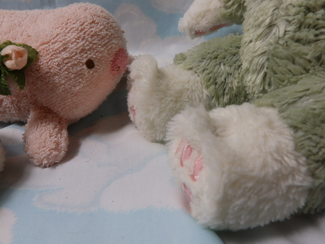 お世話になっております。うちの子たちが綺麗になっていくのは喜びです。ここまでしていただいてわがままをいうのは心苦しいのですが、こんこんさんのお尻尾の綿を少し減らし気味にできますでしょうか?前の時にもお願いしたのですが、元々それほど厚みのないお尻尾なので超巨大になっているような……これがお風呂効果によるもので厚みは今後落ちつくようならこのままで大丈夫です。ほっぺと尻尾の先のふわふわが嬉しいです。これは素人がどんなに頑張っても出来なかったことですありがとうございます。ジェラちゃんのお尻尾ですが、これもわがままで申し訳ありませんが、あと少しだけ下にしていただけたら嬉しいです。当初と今の状態ので中間ぐらいが希望です。無理ならばこのままでお願いします。ジェラちゃんの足の綿ですが今までのジェラちゃんより太ましくなっているような気がします。これも新綿によるもので今後落ちつくのでしょうか?そうでないようでしたらほんの少しだけ綿を減らしていただけたら嬉しいです。もえちゃんは完璧です。元々、友人の中のルー族としては華奢な子でして、それが自慢(?)なもえちゃんです。だいえっとぉ〜ほそい うえすと をとめのひつじゅひん‼︎と宣う姿が脳裏に浮かびます。そういう子なんです(涙)なめらか温泉でツヤツヤになってカワイイに磨きをかけることでしょう。画像はジルバを踊るジェラもえです。こんな風にスケルトンを入れていると表現の幅は拡がると思います。でもそれでジェラちゃんたちを傷つけてしまっては本末転倒ですね。みさとソーイングさんのお陰で元気になって戻ってきてくれることを楽しみにしています。ジェラちゃんは尻尾を使った三点倒立で安定して立つことができます。もえちゃんは耳が重くて自力だけで立つことは難しいです。 ◆掲示板に画像を投稿したい・投稿できない・リサイズってなーに?