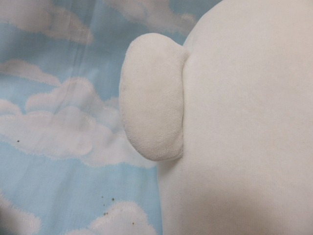 それと、うえちゃんの綿入れ口については、タマンの勘違いでした。ロックミシンで縫ったように見えたのは伝線でした。伝線していたのに、さらにそれを縫合したように見間違えてしまいました。(オフロから上がってきて判明しました)綿入れ口の上下と言いますか(写真に対しては左右)の生地にそれぞれ伝線があり対象的な位置にあるのも特徴ですが、サラミちゃんの職権で、すでに縫合して処置させてもらいました〜おそらくですが、誕生時になにかに挟まるかして、綿を入れる前に生地にダメージがあったのかもしません。(綿がなくてぺちゃんこの時に、胴体の上の生地と下の生地が合わさった状態で同じ場所にダメージがあります→横から見ると線対称の位置にダメージがある)そこが、だんだんと時とともにダメージ部分が劣化したようにも見え、そうだとすると後遺症が今になって出てきた・・・みたいな感じかなと。 ◆掲示板に画像を投稿したい・投稿できない・リサイズってなーに?