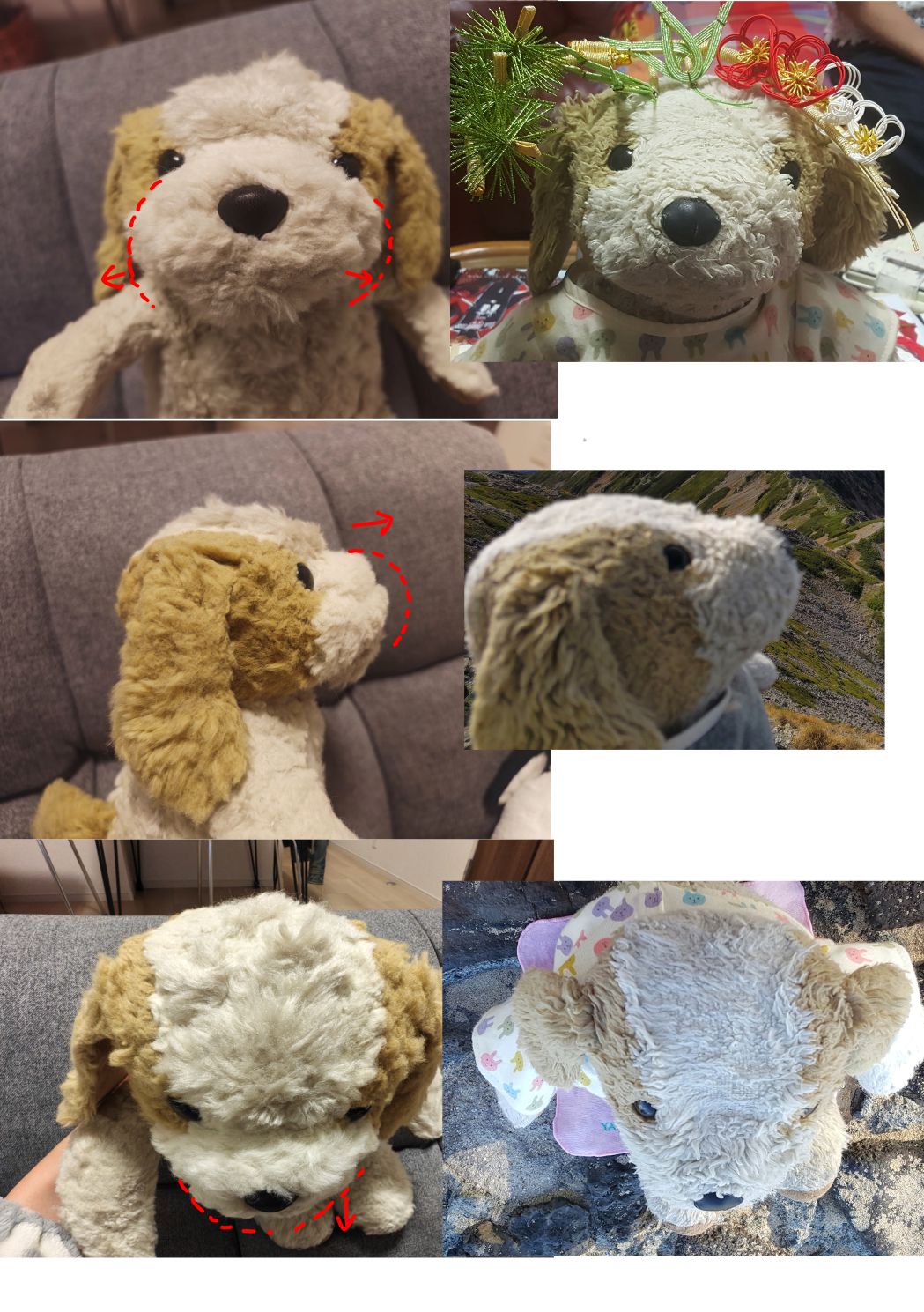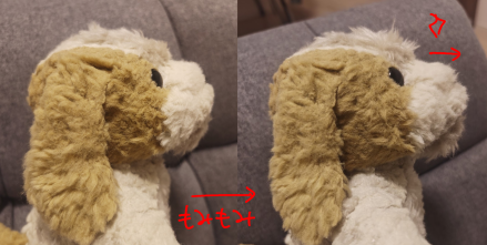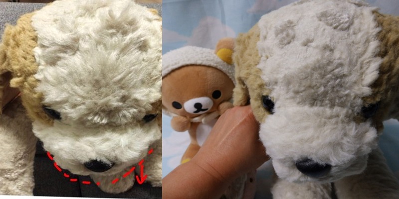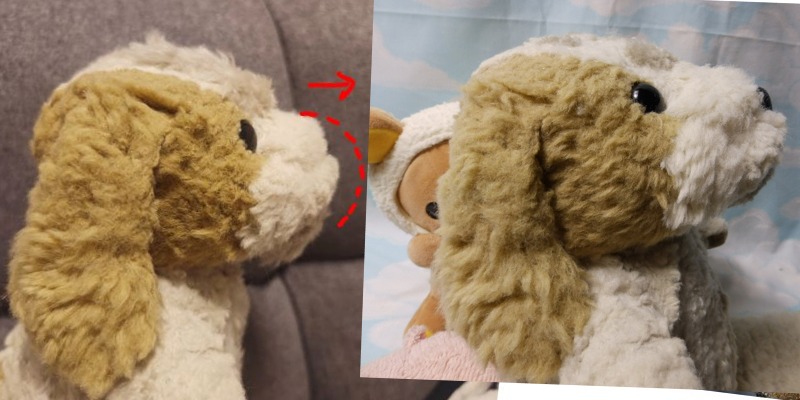 ロバート君チェックですが、手足・体・しっぽはOKです。お顔の形だけご相談なのですが、犬でいうマズルの部分、ロバートくんでいうオハナ周辺の白い部分をもう少しふっくらと&長くすることってできますでしょうか?今の写真と以前の写真を比べるとこんなイメージです(背景がいろいろですみません)。あと植毛いただいたおでこ・あごの部分はもう少しだけ短めにカットいただくこと可能でしょうか(現状ちょっとワイルドでツッパリ気味)体のほかの部分も少しカットできたらお願いしたいですが、こちらは現状でも馴染んできたらそこまで気にならないかなと思いました。 ◆掲示板に画像を投稿したい・投稿できない・リサイズってなーに?