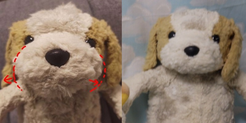 何度も投稿すみません!ロバートくんをちょっとマッサージして確認してたら、すこしマズルが成型できました。イメージこんな形です。きもちもう少し綿がいれられたらうれしいのと、この形にあわせておでこ・あごの毛を少し短くいただけたらと思います。 ◆掲示板に画像を投稿したい・投稿できない・リサイズってなーに?