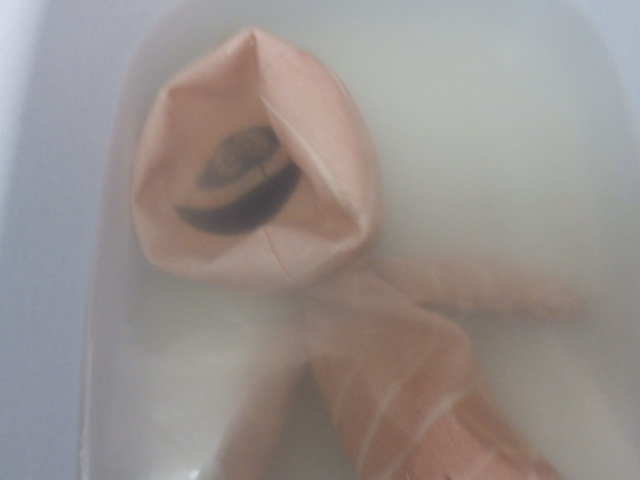 あ、こっちが先で、オフロの様子でした。それでは今回は、ミイラ君、34cm/95gで計算しまして、オフロ2700円、綿出し別洗1300円、ビ白スカ湯1300円、手の縫い止まり両手で1400円、お帰りウンチん1000円、小計7700円でおねがいします〜両手についてはあまりにふにゃふにゃしているので、ややふっくらめに回復させます。ふくよかになるとミイラっぽくなくなるかな? ◆掲示板に画像を投稿したい・投稿できない・リサイズってなーに?